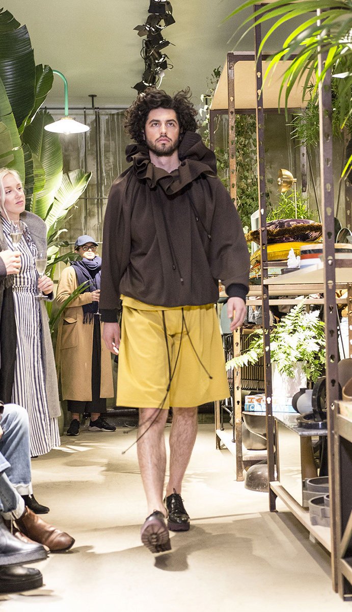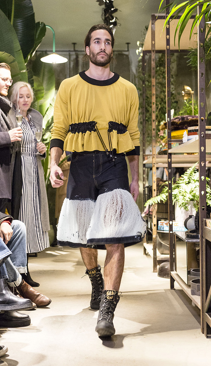 Down with binary thinking, up with Aleksander Sahr! His Oslo Runway debut showcased menswear with ruffles, high-waisted skirts and loads of color. His drawstring “corset” tops are an easy-breezy take on the classic silhouette, without the breathing restrictions.