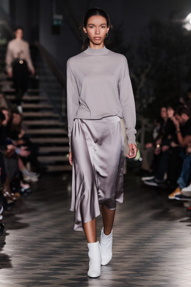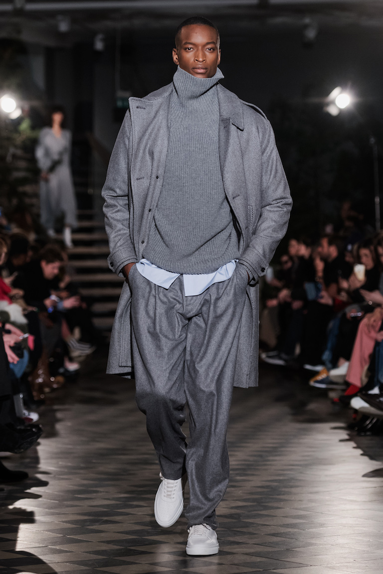This year was Filippa K’s 25th anniversary and they decided to go big, in the most minimalist way possible. Doing what they do best, the brand yet again made the case for tasteful, sleek minimalism. They stuck to a color scheme of white, black, navy and grey; their all-grey looks in particular were a masterclass of artful hue and texture layering.