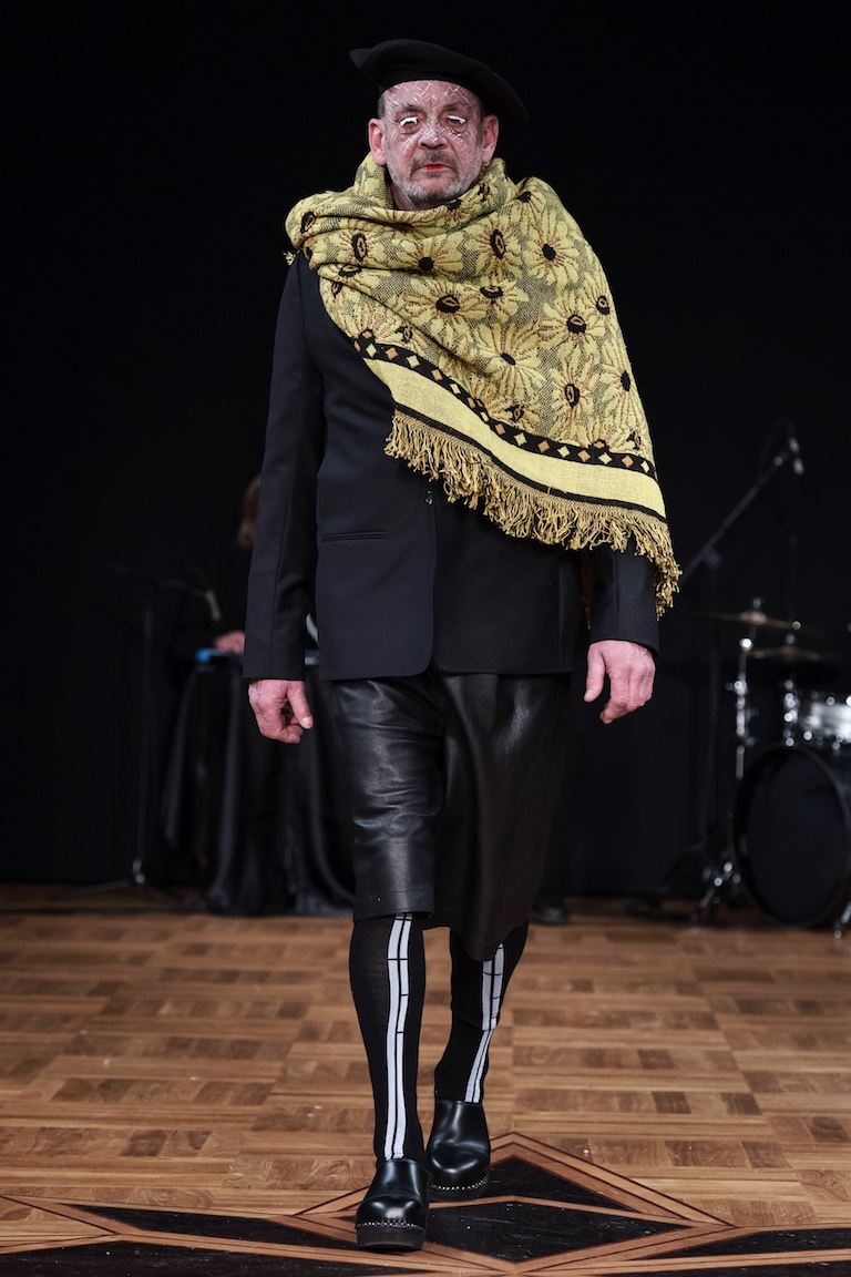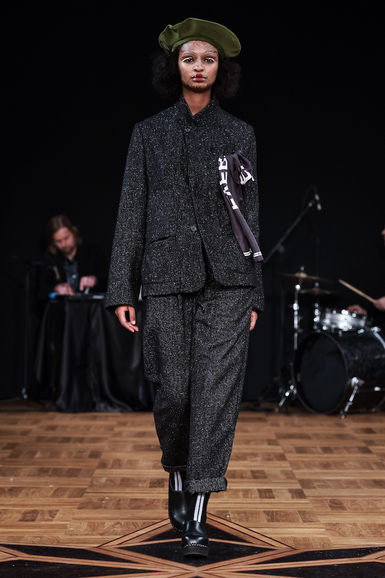 Yes, Johannes Adele! With a black, white and moss green color palette, Adele has brought together influences from the traditional Bolivian sombrero and shawl-draping, Swedish pattern-making, and American 40s and 70s suiting. The shine of the leather against the warm colors of the shawl, and the impeccable tailoring of his tweed, made for an incredible blending of cultures and periods that looked all-together modern.