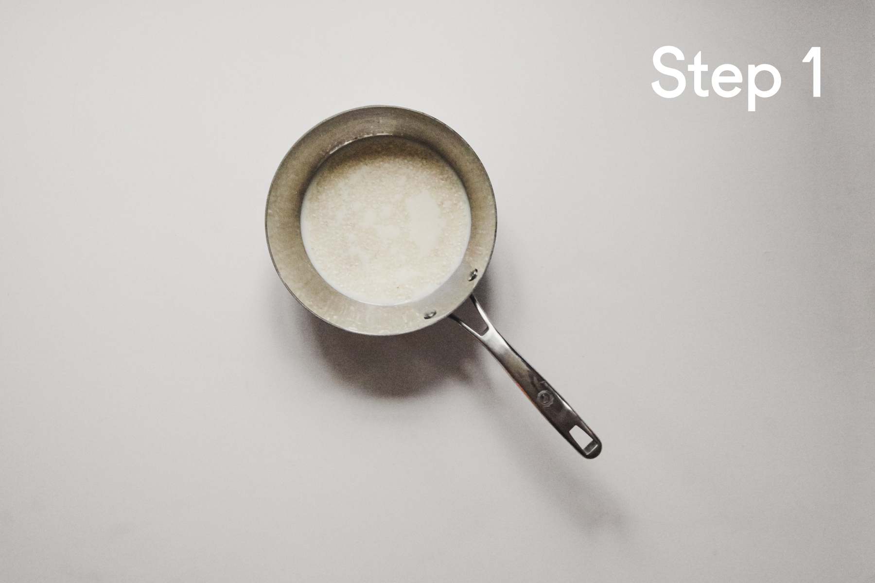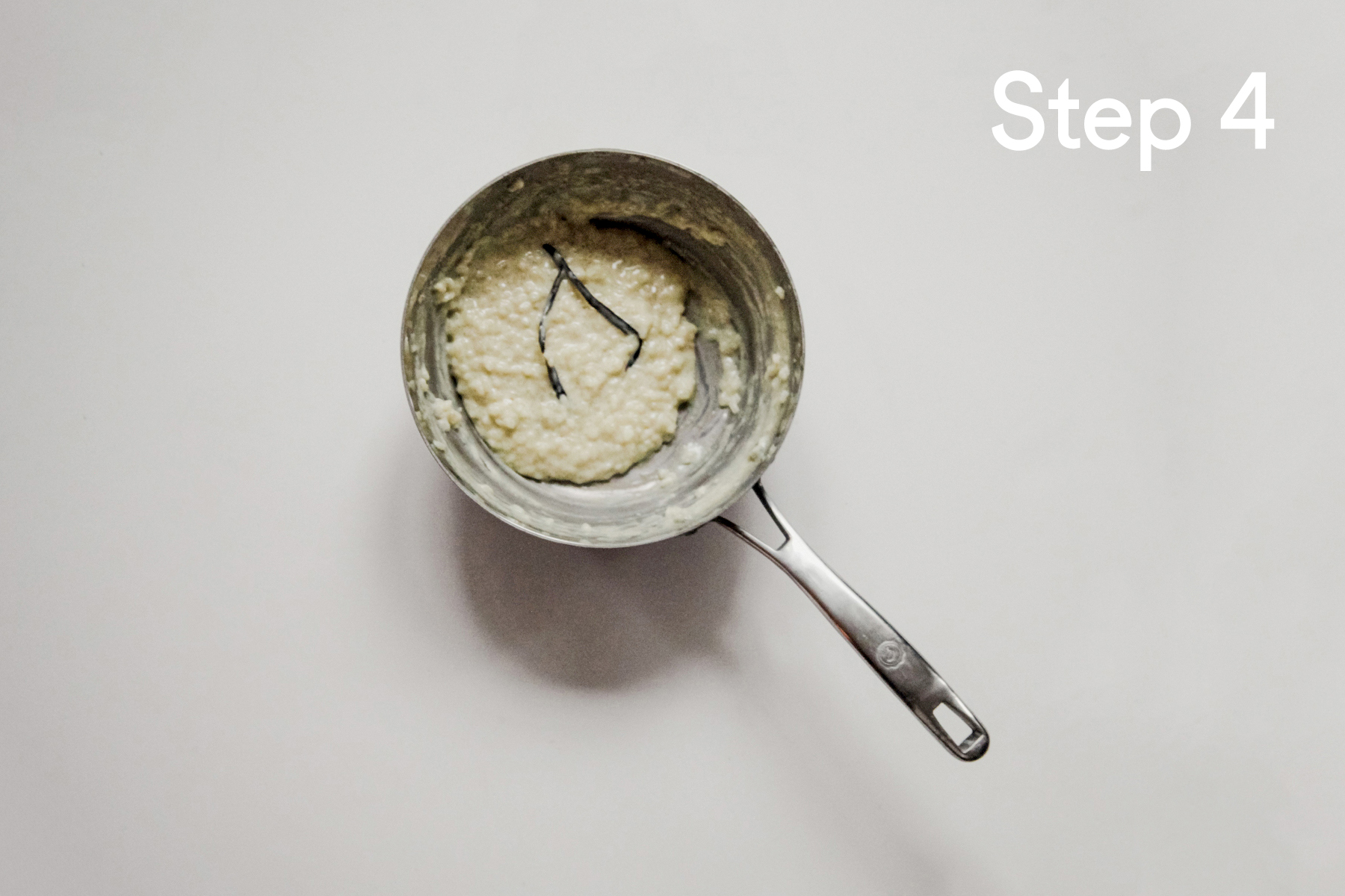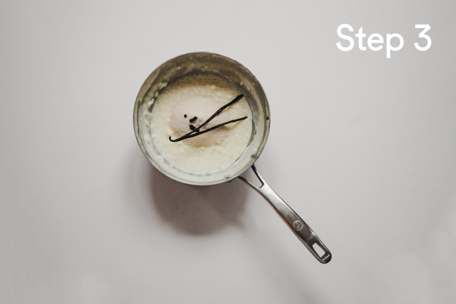 Split the vanilla bean and scrape out the seeds. Add the seeds to the saucepan.