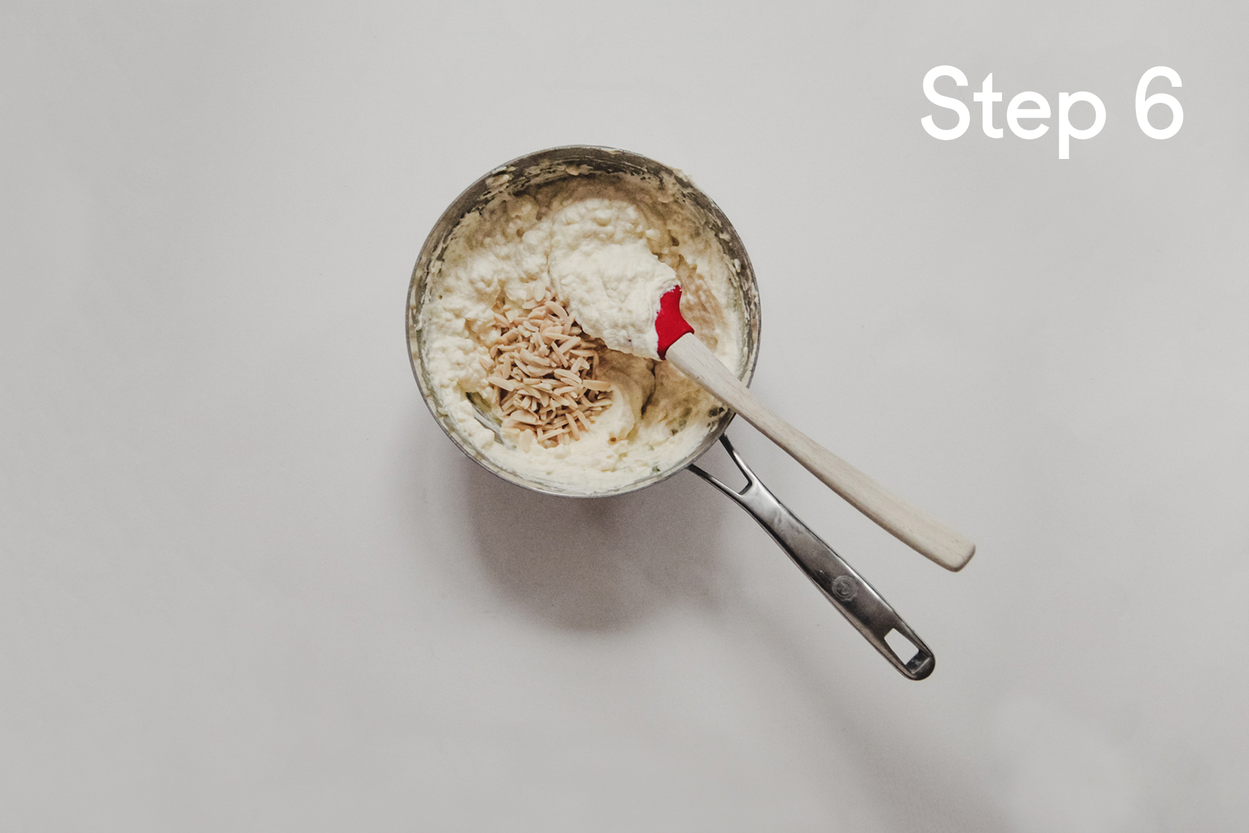 Add almond slivers plus a whole blanched almond. Almonds can be blanched by popping them in boiling water, then rinsing them in cold water; the temperature shift removes the skins.