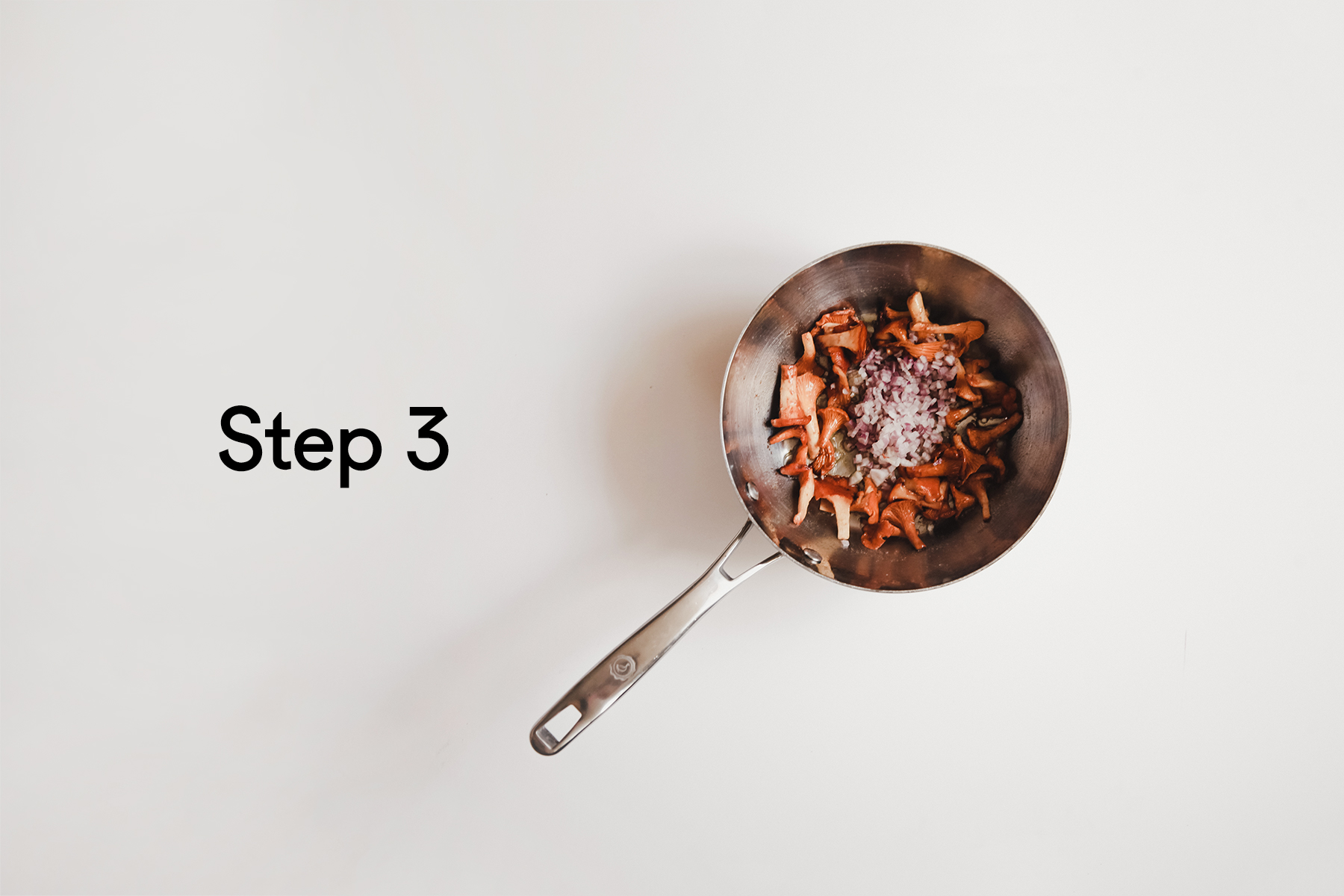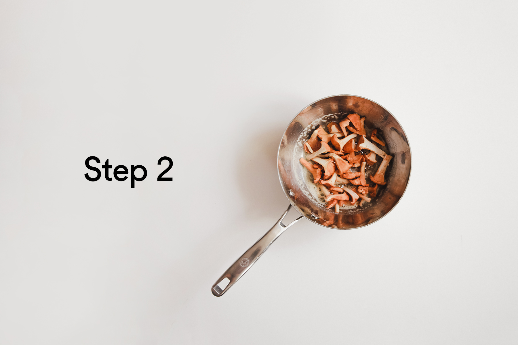Preparation is an important step in this recipe. When you begin cooking, everything will go quite fast. Start by cleaning your mushrooms, brushing away any dirt and halving them. This is optional, depending on the size of your mushrooms. Want to know the secret to crispy chanterelles? Don’t wash them. They soak up water like a sponge!