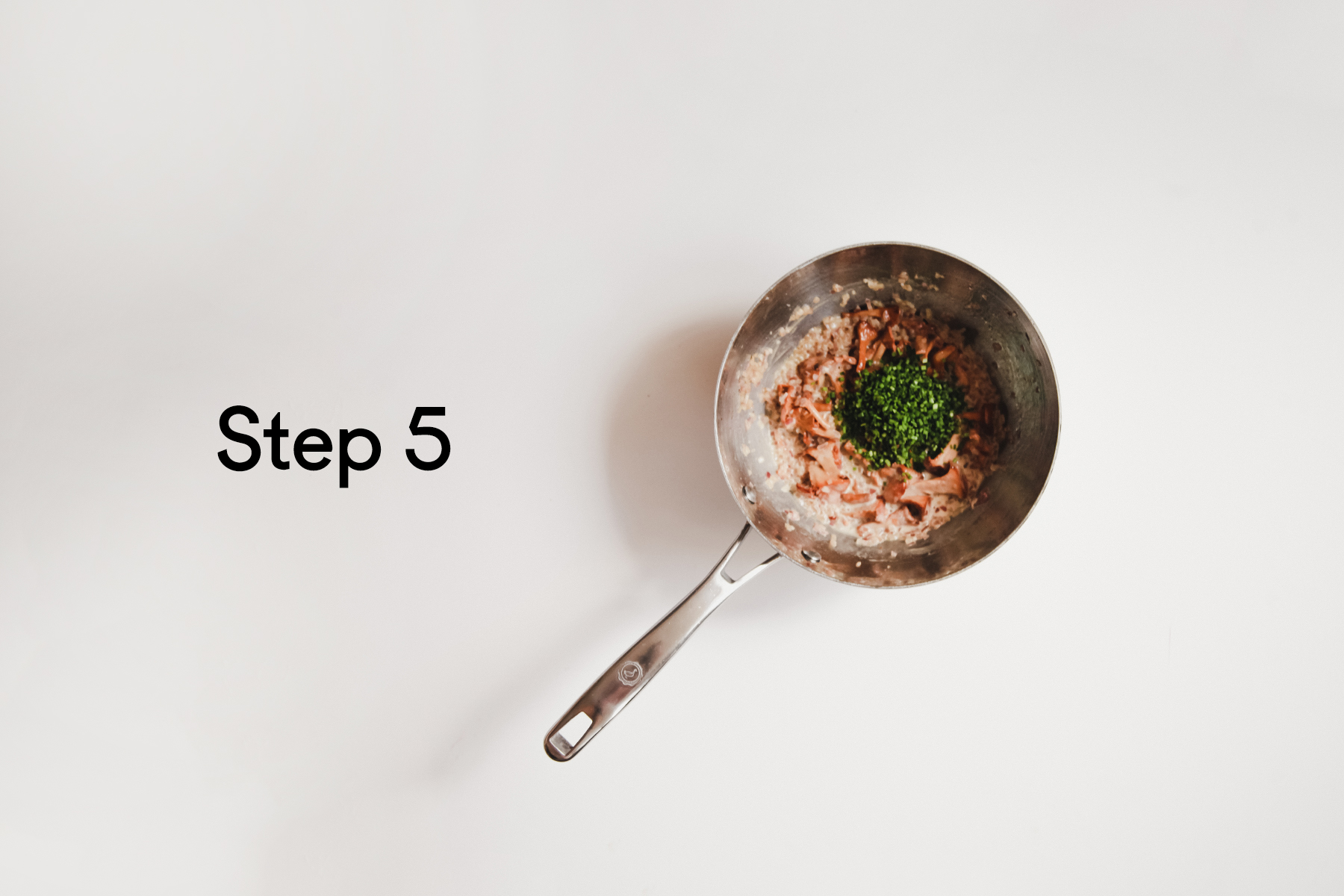 Add minced shallots to the pan. They will only need about 30 seconds to turn translucent and soft.