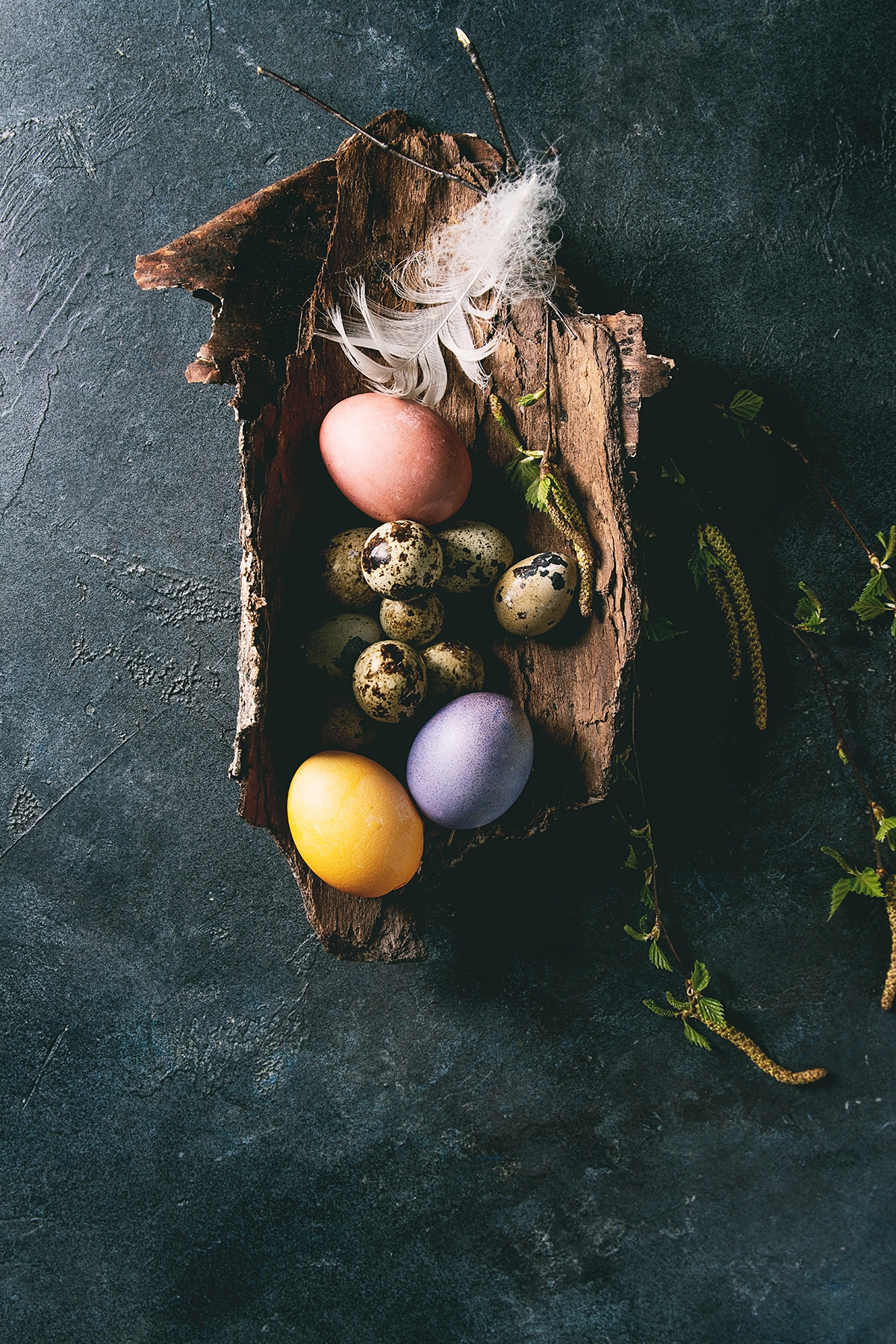 Birch twigs are decorated with brightly colored feathers. Some are displayed at home, and a few extras are scattered in the garden (or wherever the egg hunt will take place) for intrepid children to find while scavenging.