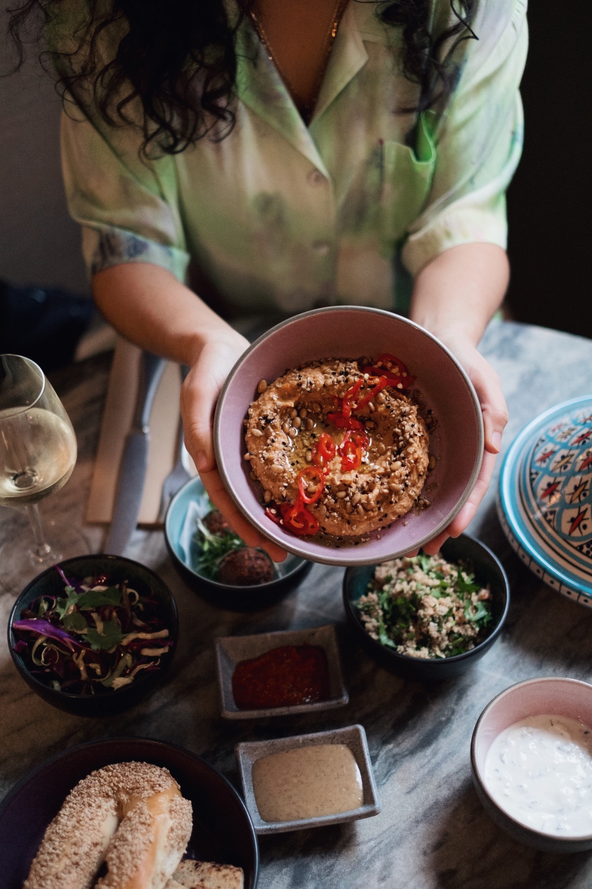 Flatbread, hummus with pickled chili and dukkah, falafel, fattoush, and onglet with cous cous and herbs. An explosion of flavors, textures, aromas, and colors that left us feeling drunk with happiness and awe.