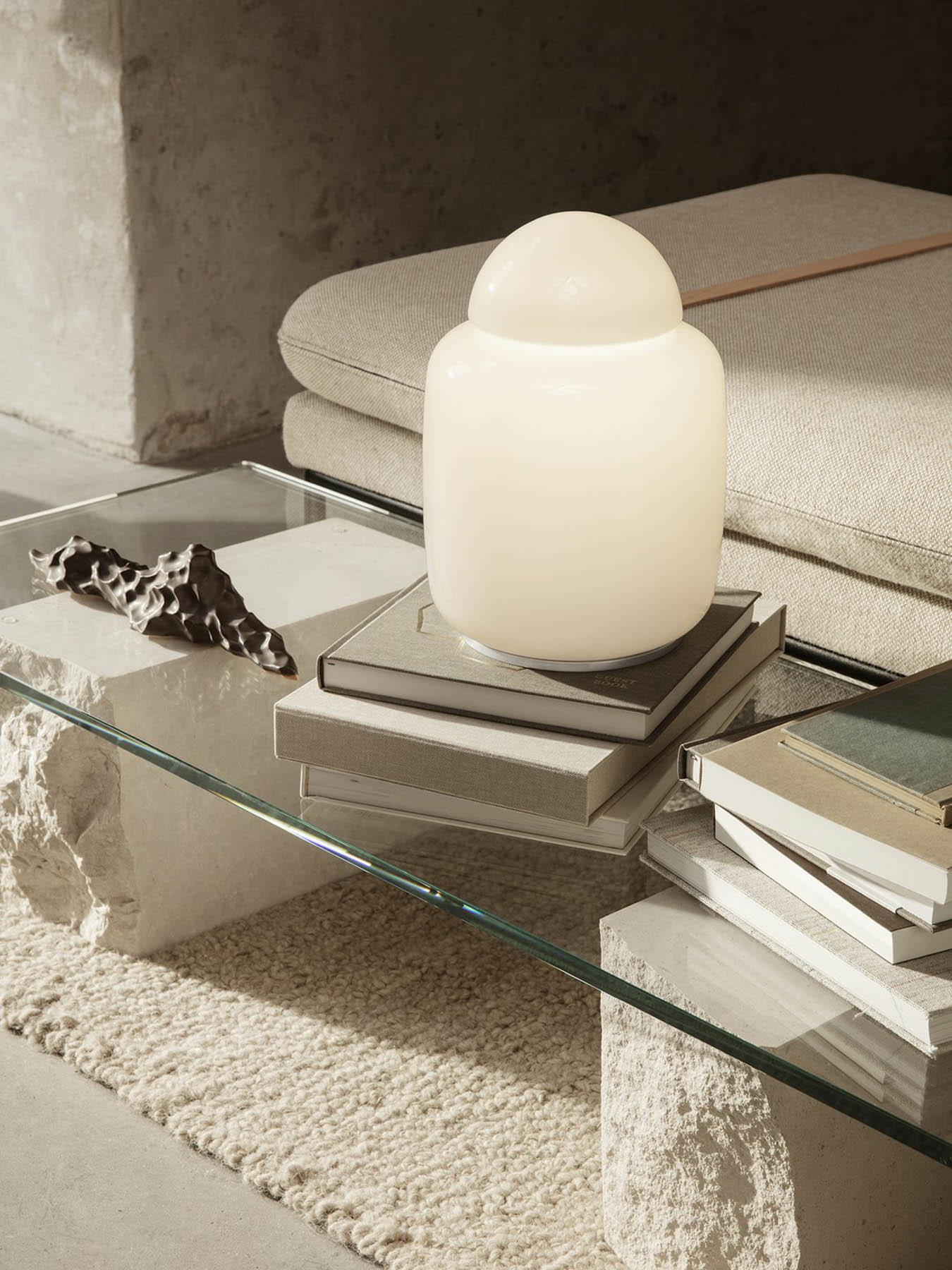 Inspired by glass lamps from the 70s, Ferm Living’s new Bell Table Lamp is just what we all need on dark evenings. Made of milk glass with a sleek glossy finish, the lamp consists of two simple geometric forms placed on a chrome base.