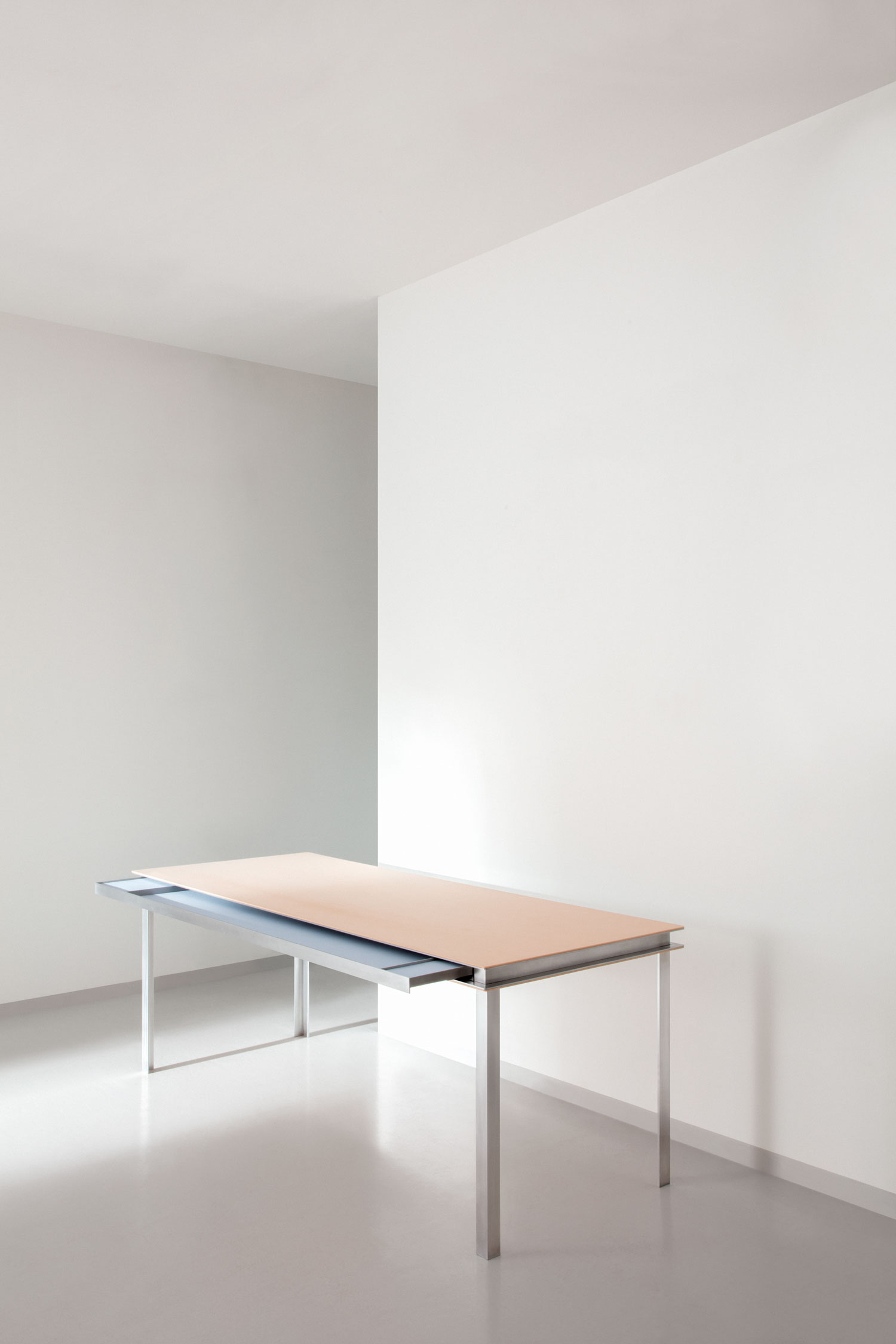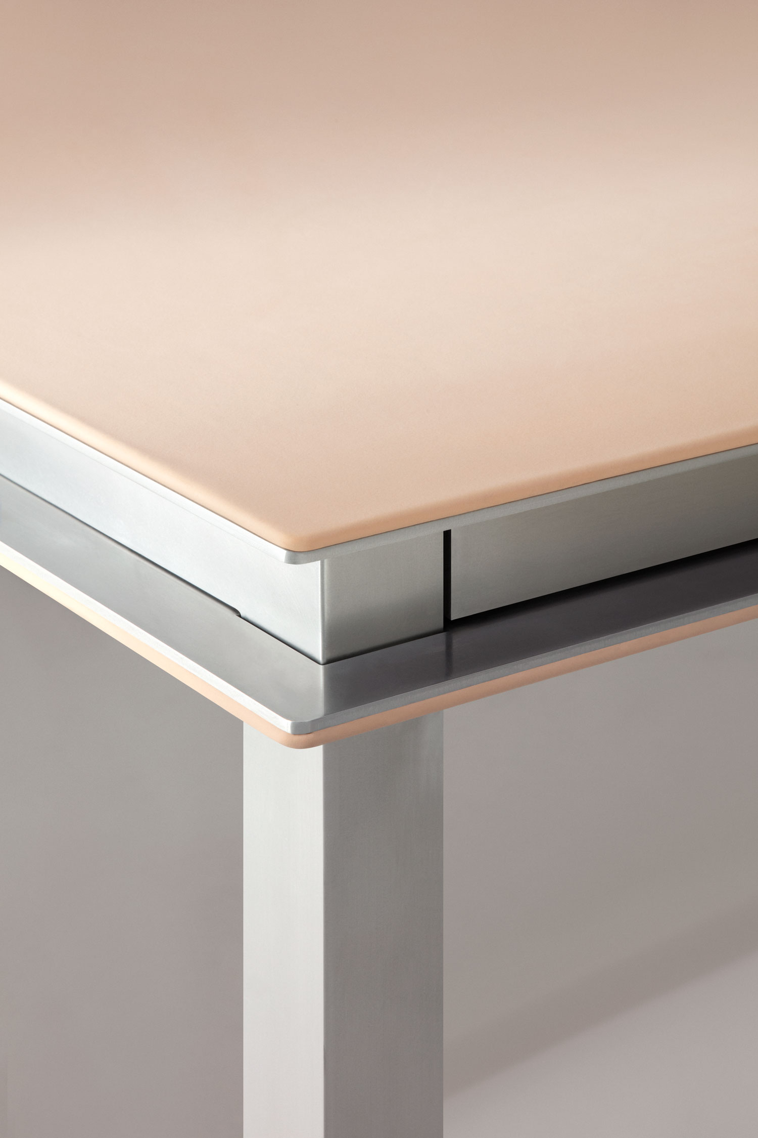 Home office during the day, dinner table at night, the table DT.013.01, for example, can be transformed within seconds. Simply open the discrete drawer, put your work utensils inside, grab a plate, and you are ready to go. The table pairs satin-polished steel with FLUX®, a new type of protected leather that resembles nubuck and was developed in close collaboration with Sørensen Leather. FLUX® has a matt look akin to neoprene, featuring a velvety-soft surface with a muted effect.