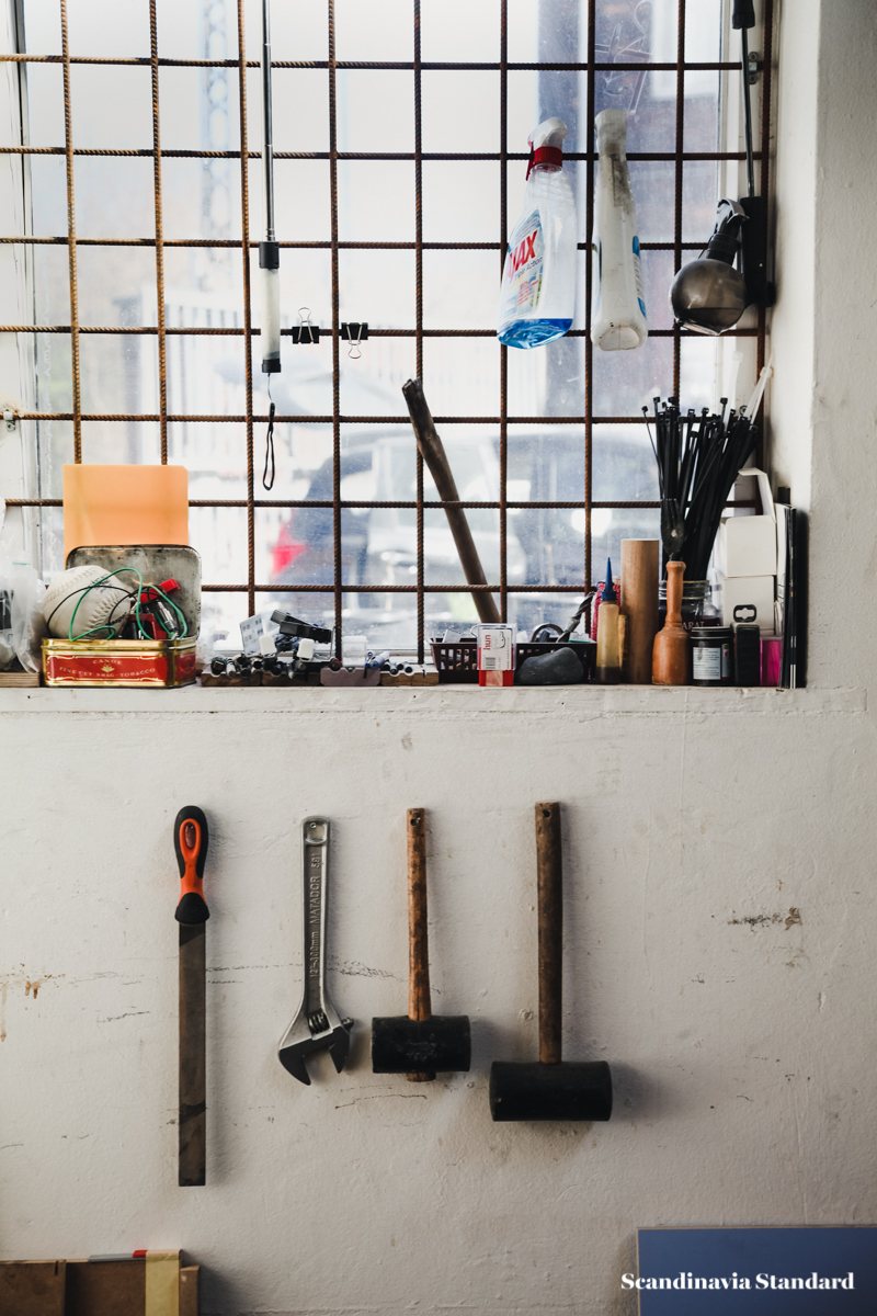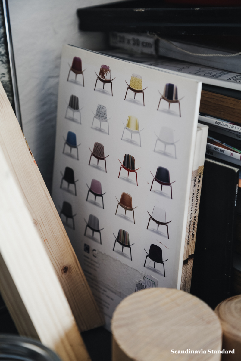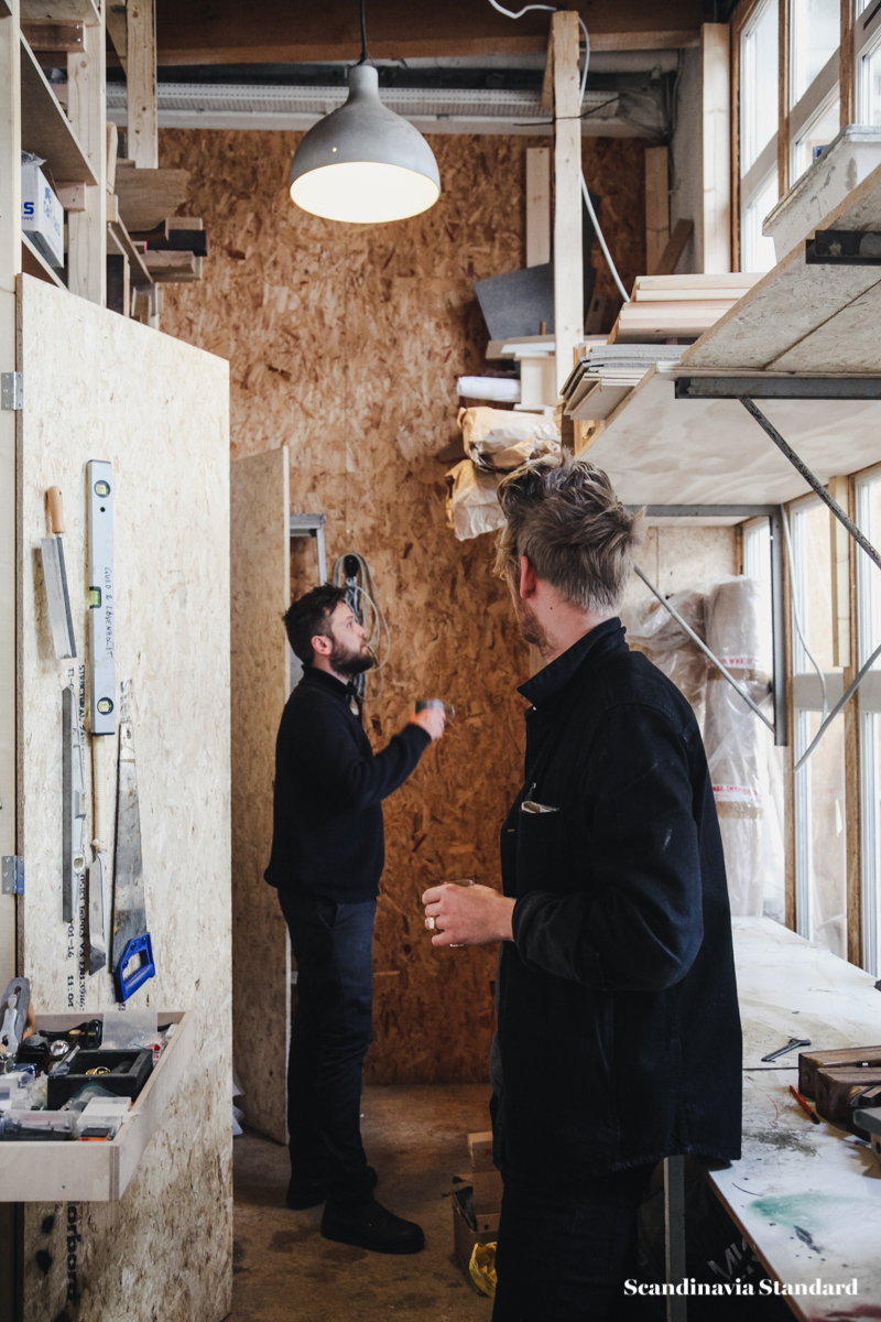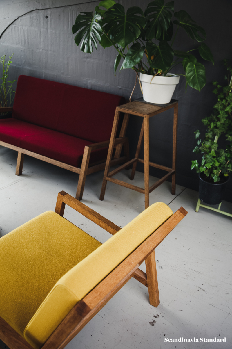 Though the studio is an attic space with a low ceiling, Anders and Casper have made it feel…not exactly big, but as though the space never ends. A secret garden, or maze. There are nooks, crannies and corners to discover as you wander through the studio, and the best discovery of all is when the sun hits one of their chairs or sofas just right and for a moment you might as well be sitting amongst the tree tops somewhere along the Equator.