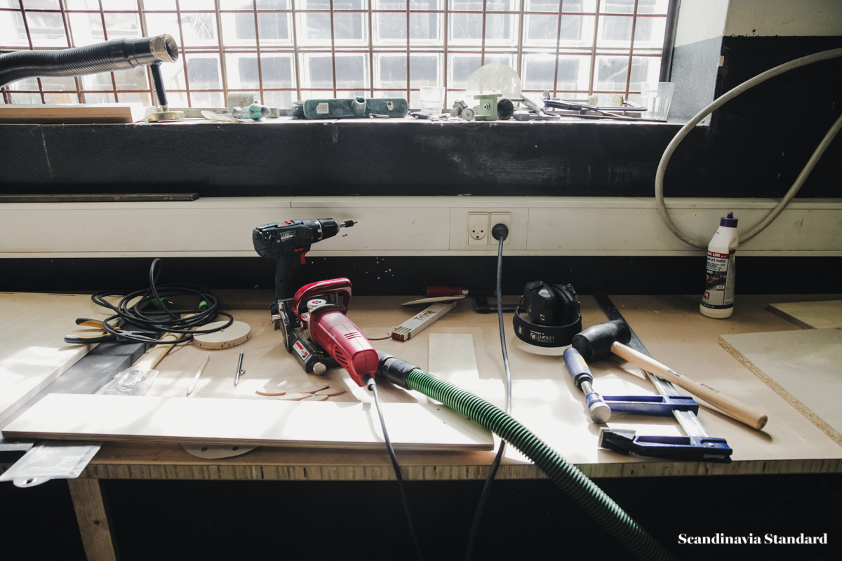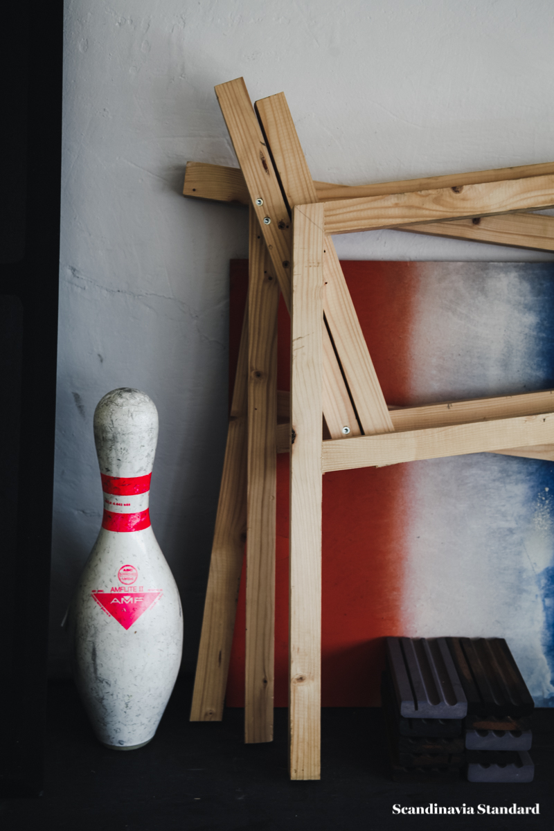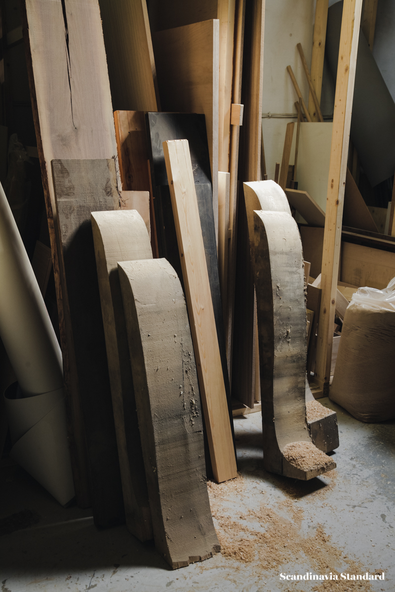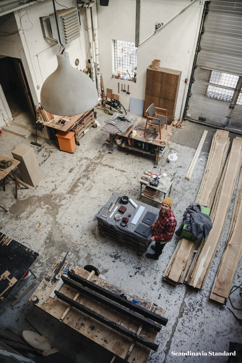 Though the studio is an attic space with a low ceiling, Anders and Casper have made it feel…not exactly big, but as though the space never ends. A secret garden, or maze. There are nooks, crannies and corners to discover as you wander through the studio, and the best discovery of all is when the sun hits one of their chairs or sofas just right and for a moment you might as well be sitting amongst the tree tops somewhere along the Equator.