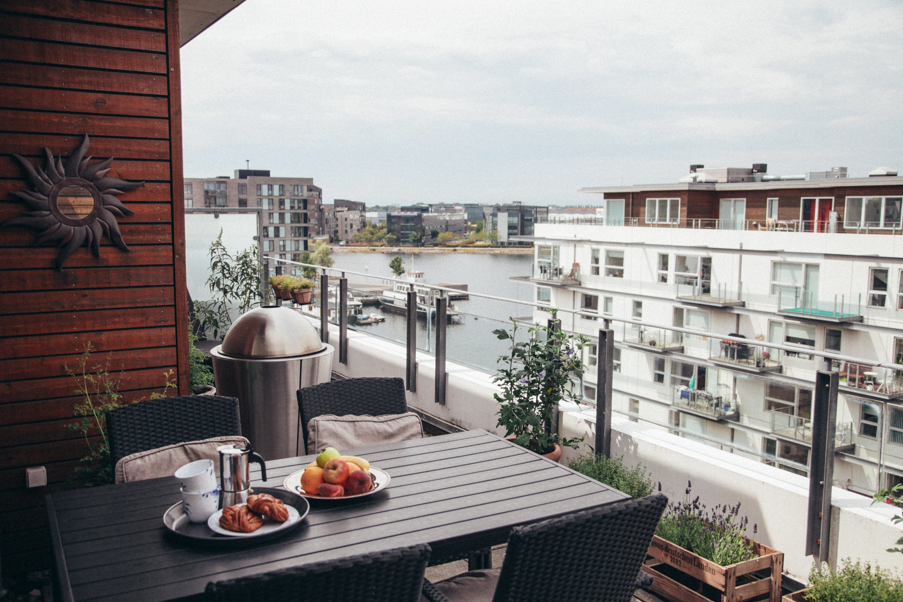 Lars moved into the apartment in 2017, while Charlotte joined in 2018. The space is open-plan, with a large kitchen/dining/living room area. There are two bedrooms, two bathrooms, and three balconies that allow you to take in the lovely water view.