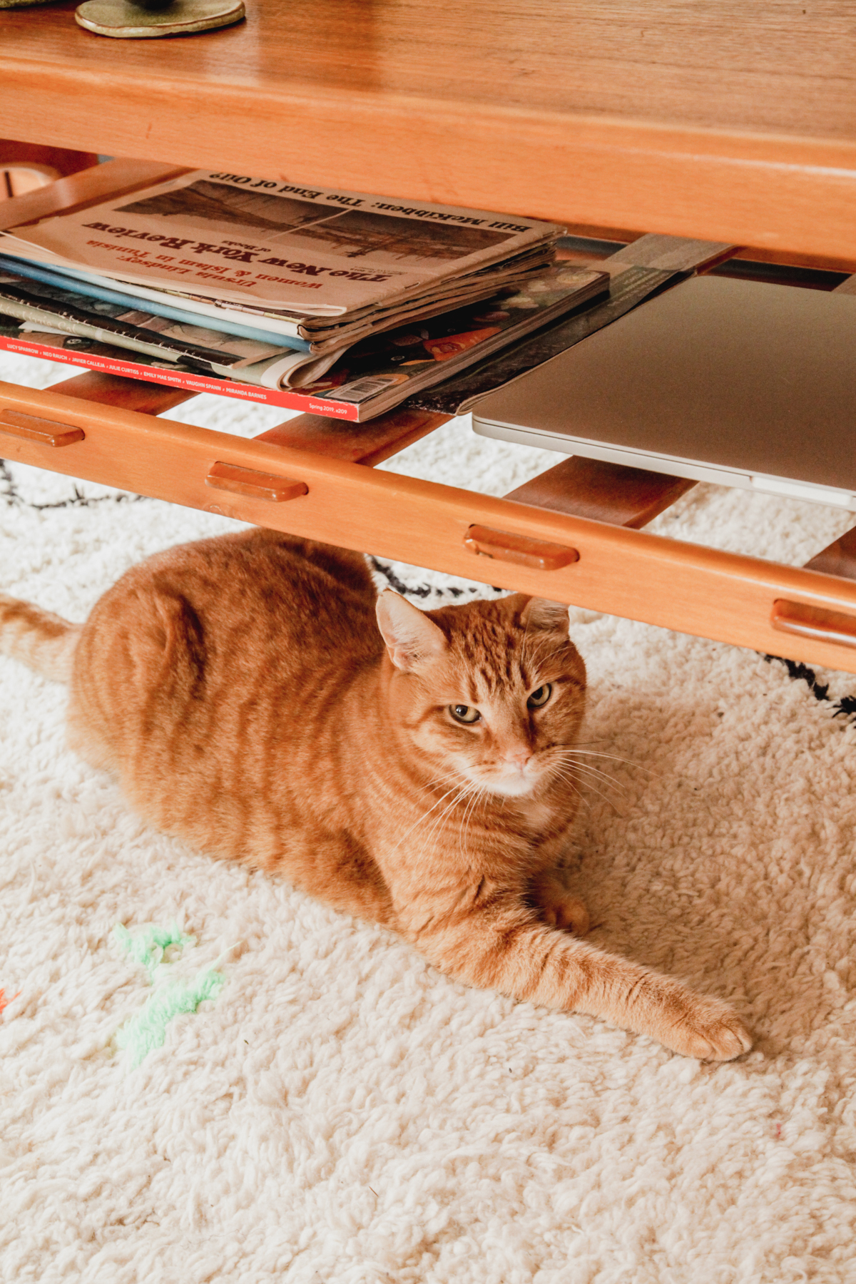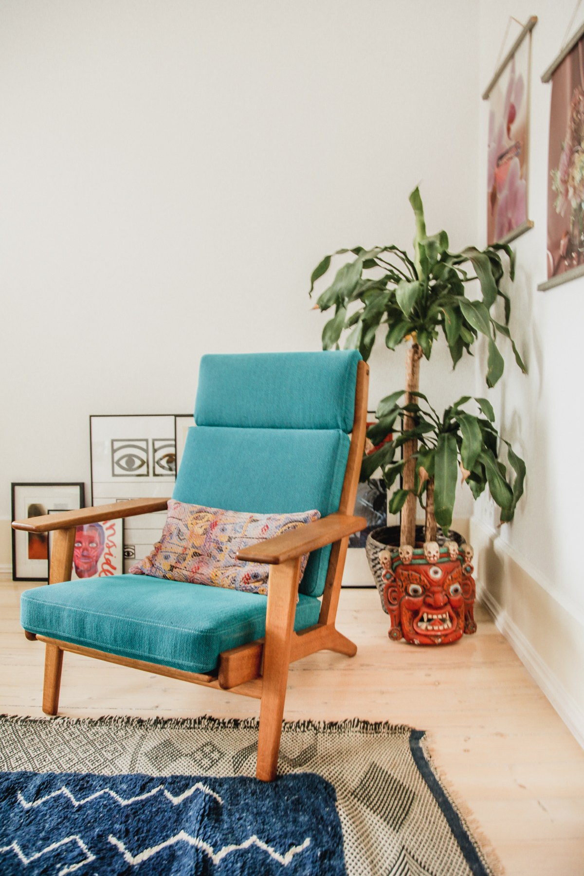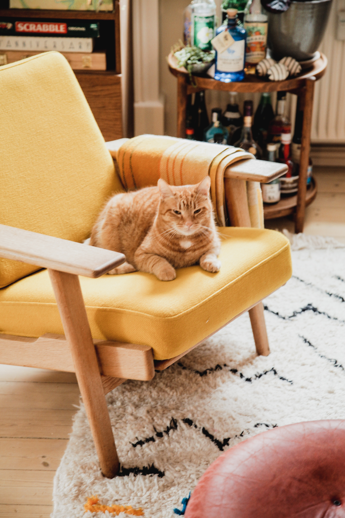 Sophia: We have a lovely cat named Rhubarb who runs the house! This is his favorite chair. We laugh that Rhubarb uses this beautiful Wegner chair even more than we do.