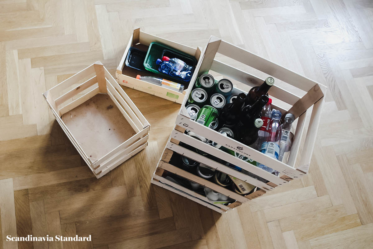Crates from Aarstiderne, an organic farm located north of Copenhagen that delivers direct to your door, are perfect for creating your own recycling system. Simply collect them, stack and label. Done. Easy.