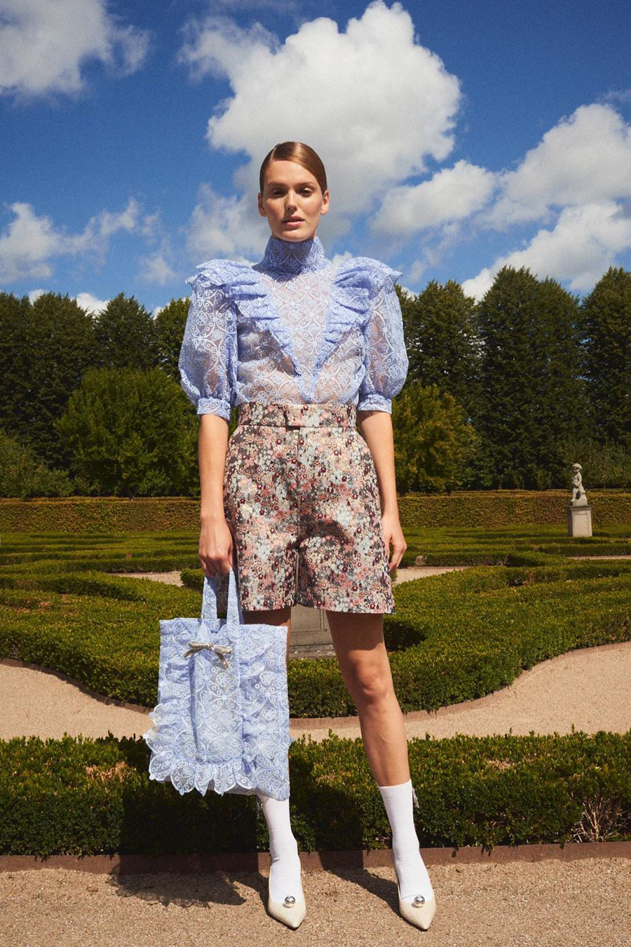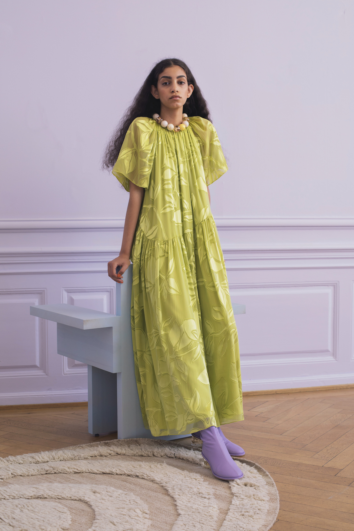 At Rixo, lime green with faint touches of lilac was used for a vintage-inspire floral print; Henrik Vibskov used a textured mint green with a graphic pastel purple print; Lovechild 1979 favored a pastel with violet undertones for its show-stopping coat, worn by the delightful Anna Von Rueden; Brøgger had a sheer, acerbic take for its floaty summer dresses; as ever, Stine Goya drew with every color in the crayon box in reiterating their commitment to a more inclusive and representational narrative, but used mints, lavenders, and acid brights heavily to capture its Fauvist movement-inspired collection.