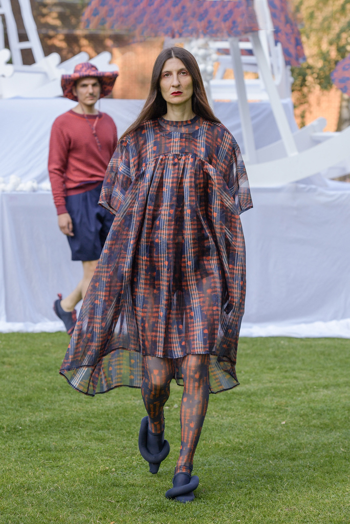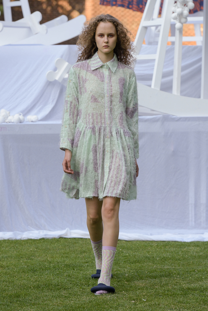 At Rixo, lime green with faint touches of lilac was used for a vintage-inspire floral print; Henrik Vibskov used a textured mint green with a graphic pastel purple print; Lovechild 1979 favored a pastel with violet undertones for its show-stopping coat, worn by the delightful Anna Von Rueden; Brøgger had a sheer, acerbic take for its floaty summer dresses; as ever, Stine Goya drew with every color in the crayon box in reiterating their commitment to a more inclusive and representational narrative, but used mints, lavenders, and acid brights heavily to capture its Fauvist movement-inspired collection.
