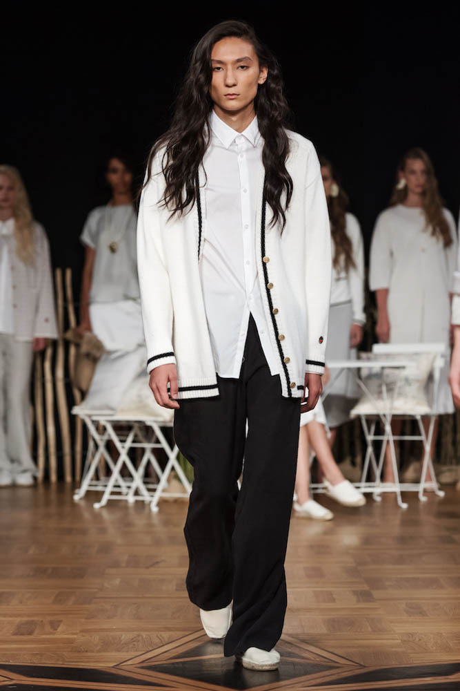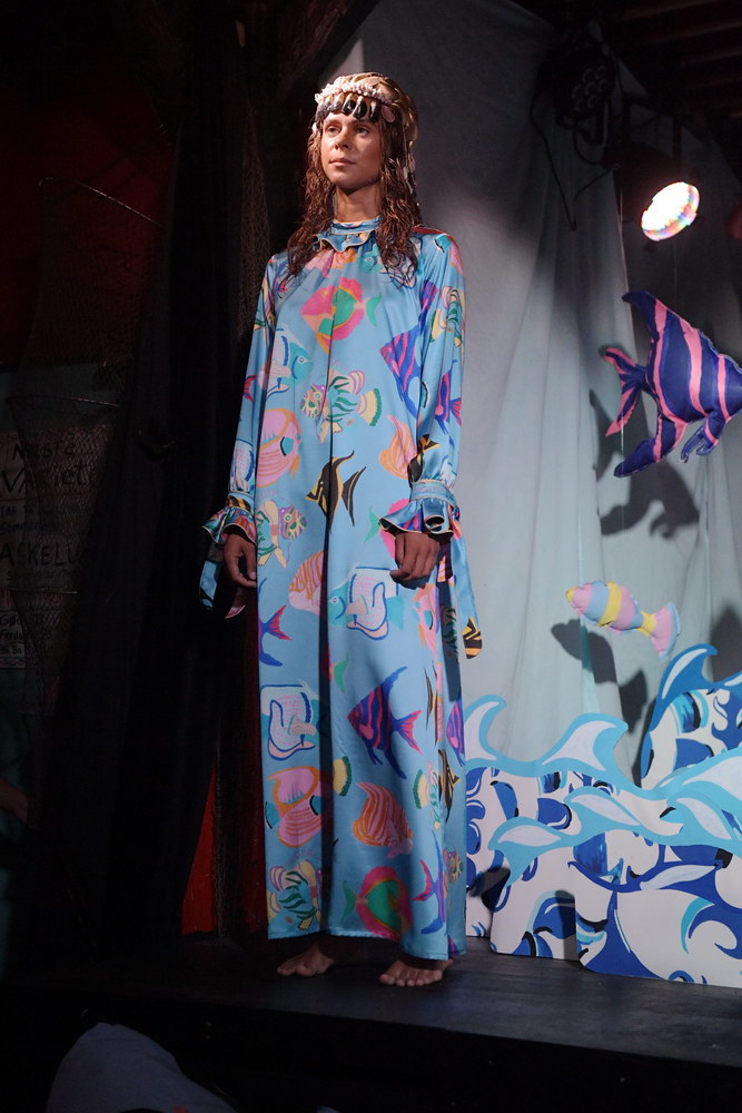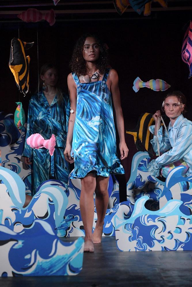It was so refreshing to see Emilie Helmstedt’s DIY presentation, which featured her silky, quirky clothes against a backdrop of hand-made fabric fish and set pieces straight out of a high-school performance of “The Little Mermaid.” It was cool, charming, and unpretentious.