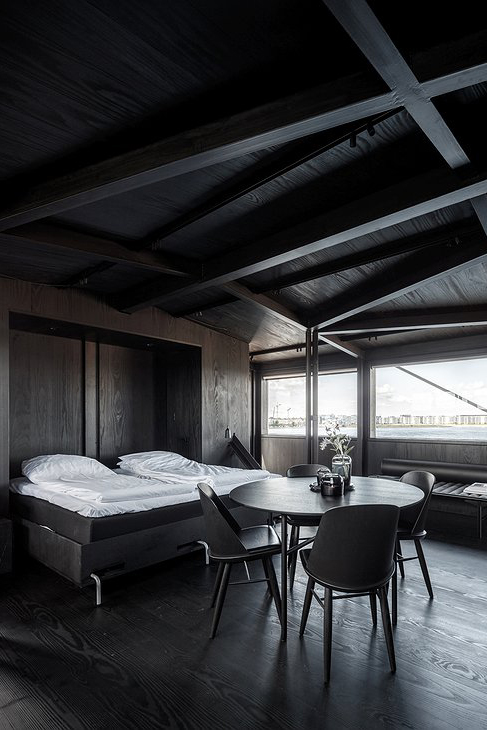 A one-room hotel in one of the most unconventional spots – the old engine room of a disused coal crane. Featuring modern, minimalist decor with beautiful and functional Danish furniture with an all-black design that creates a sense of intimacy and calm. Guests have exclusive access to two terraces in each direction for both sunrise and sunset views, as well as a small lounge in the old crane operator compartment at the top of the crane.