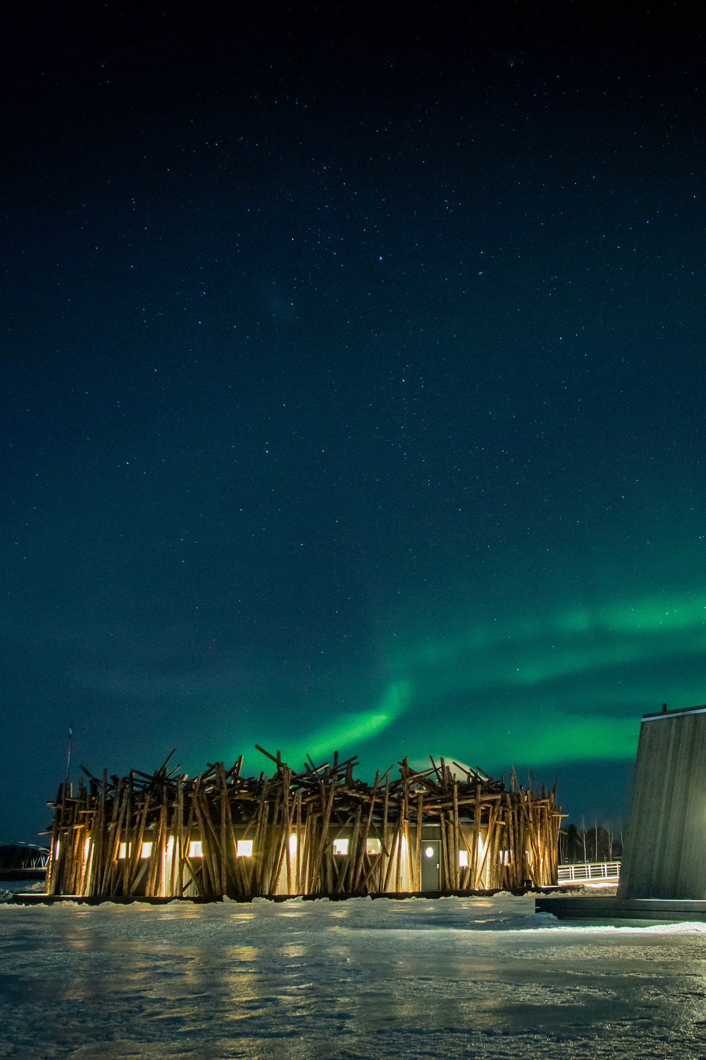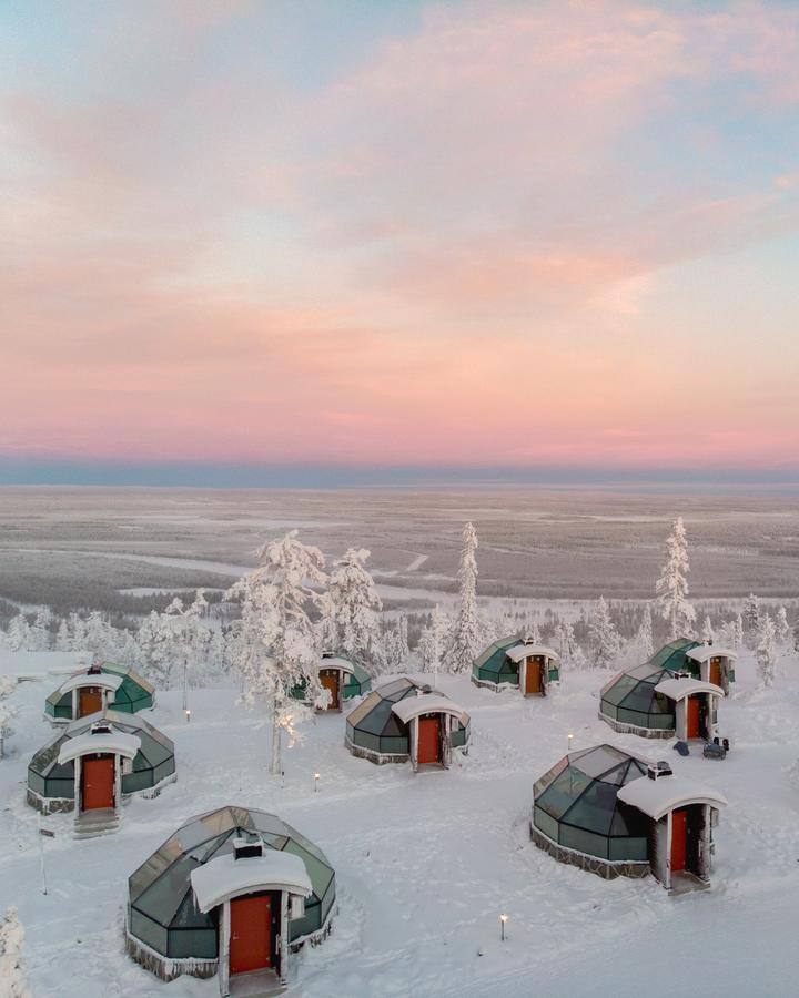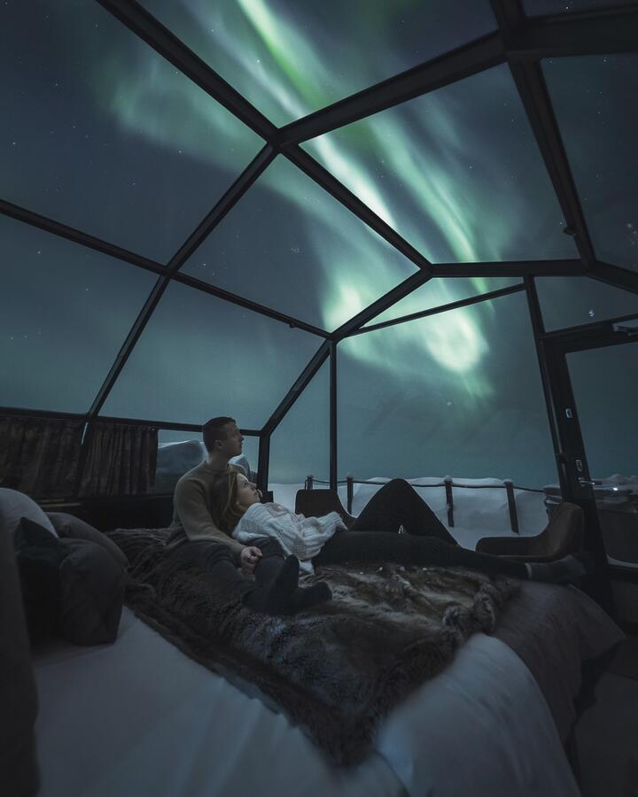 The hotel’s restaurant also has a glass roof, allowing you to dine under the ethereal light display while you eat the offerings of an ambitious kitchen that has been praised as the best in Lapland.