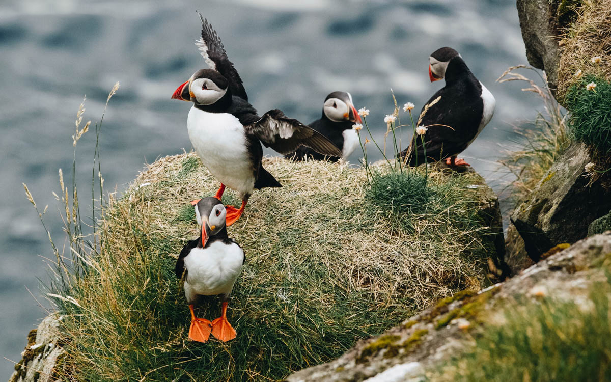 Nowadays, Vestmannaeyjar is home to the world’s largest population of nesting puffins. Some ten million puffins nest here during mating season! The island also boasts some impressive whale-spotting opportunities, with Fin, Minke, and Humpback Whales seen often in summer, and Orcas throughout the year.