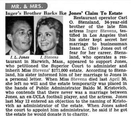 Following her death, Ike Jones claimed to have been secretly married to Stevens. Although there was no marriage license, they had maintained separate homes, and continued to file tax documents as single people, at the time Stevens’ estate was being settled the court ruled in Jones’ favor and made him the administrator of her estate.