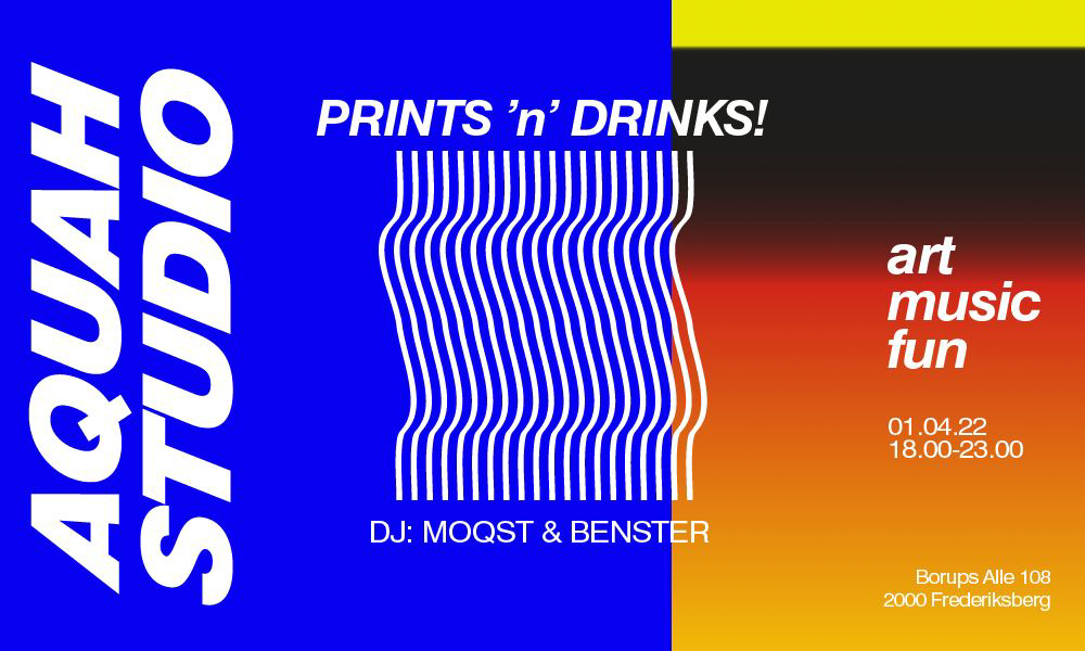 Browse prints, have a drink, and enjoy some good music at Aquah Studio’s new event concept. There will be 10% off all prints and the possibility to win at the give-away contest. Aquah Studio is a result of lockdown days spent at home: After creating a poster for Christmas 2019, John Indome started making prints at home, taking inspiration from 80s and 90s designs. Get yours from 6-11:30 pm.