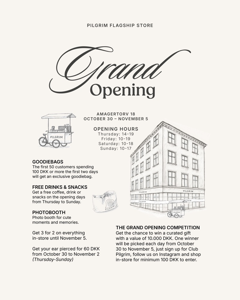 Danish jewelry brand Pilgrim opens its new flagship store on Amagertorv and you’re invited. Designed in collaboration with Copenhagen-based architecture and design studio Spacon & X, it expands the concept of a traditional jewelry store, encouraging community and exploration. The new flagship store will also function as a curated platform for design, objects, and art – with Freja Wewer as the first curator for the opening. Stop by to explore her curated universe, check out Pilgrim’s genderless collections and pieces crafted from recycled materials – a practice that today accounts for 75% of their jewelry – and enjoy the unique opening offers.