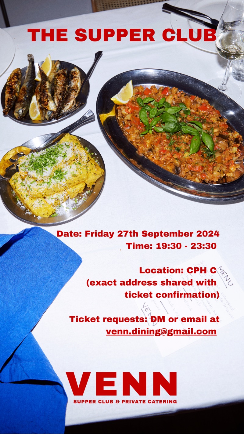 Join for the first dinner party of this brand new concept from 7:30 to 11:30 pm at Sølvgade in central Copenhagen. Tickets cost 475 DKK and include three courses with wine or kombucha pairing plus snacks and a welcome drink. Reserve your spot via [email protected] or via DM on Instagram at @venn.dining. Can’t make it or didn’t manage to snag a spot? Stay tuned for upcoming dates.