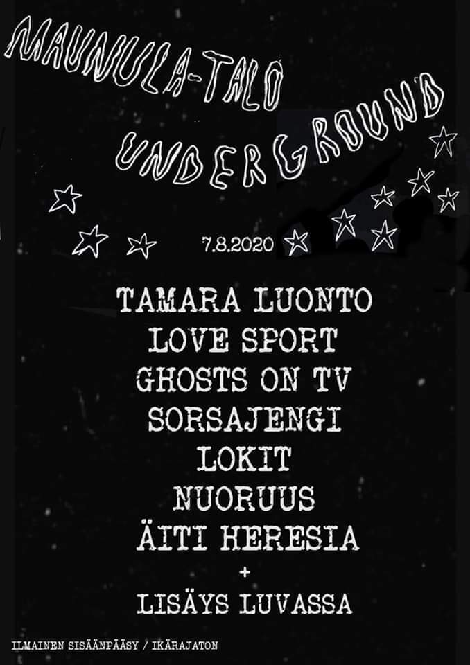 This free music festival brings eight bands to the stage in culture hub Maunula-talo. Äiti Heresia, Nuoruus, Future Box, Sorsajengi, Ghosts on TV, Love Sport, Tamara Luonto, and more will entertain you with music ranging from punk to experimental.