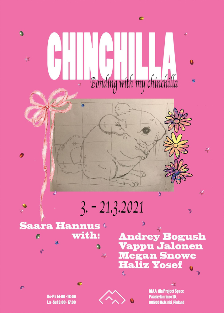 Inspired by a first grader’s presentation about “furry bunnies of Finland”, Saara Hannus made the chinchilla the lead star of her exhibition. “Chinchilla,” studying cuteness and caressing, may be visited by max 4 people at the time. From 3rd to 21st March.